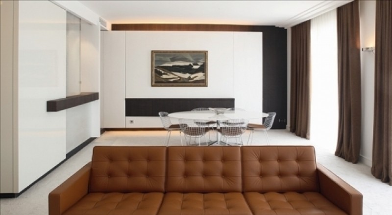 الصالون وغرفة الطعام يجمعهما فضاء واحد، والأثاث البسيط الذي اختير لهما بعناية فائقة يجمع بين الرفاهية والعملية والجمال. ولكنه أيضاً يحافظ على فضاء المكان ويمنح الساكن شعوراً واقعياً بالاتساع والرحابة. ففي ركن الجلوس كنبة كبيرة من الجلد البني المحمر بقوائم معدنية تذكر بأثاث الستينات وتتسع لثلاثة أفراد، وهي تواجه عنصر أثاث خشبي أبيض يغطي مساحة الجدار المقابل.