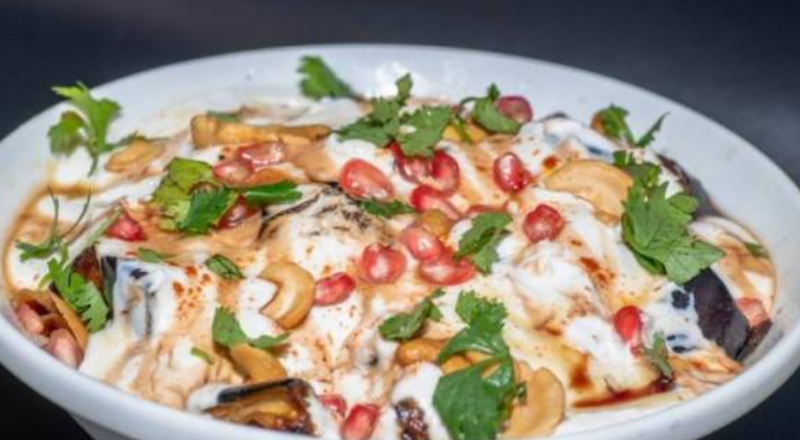 في طبق التقديم نضع طبقة من الخبز المحمص وفوقه الخضار المقلية والمتبلة ومن ثم نغطيها بصلصة اللبن ونزين بحبات الرمان والبقدونس والمكسرات وصحة وهنا .