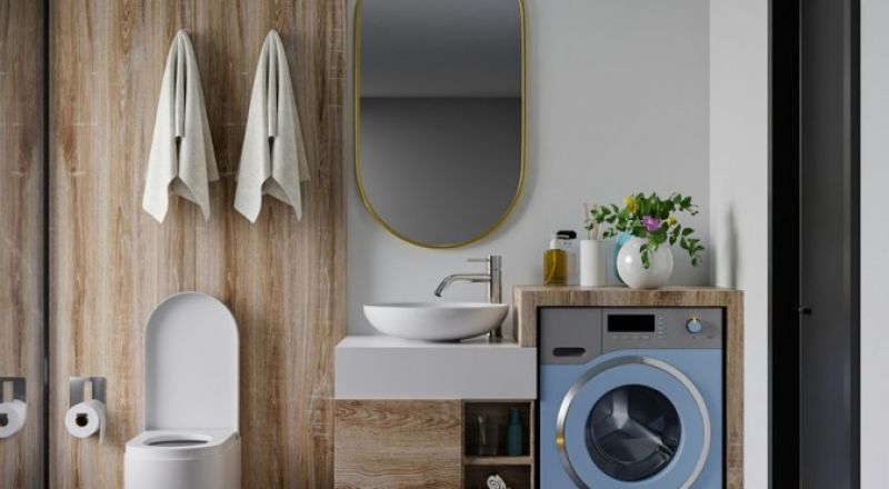 دمج الغسيل بالحمام أو على جدار واحد: يمكن إخفاء المعدات داخل خزائن بباب جرار لإضفاء مظهر أنيق ومرتب.