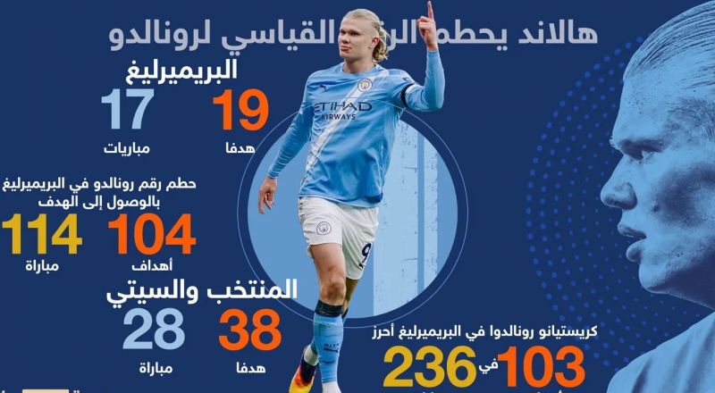 واصل القناص النرويجي إرلينغ هالاند تحطيم الأرقام القياسية مع مانشستر سيتي بمعدل تهديفي مرعب يتجاوز الهدف في كل مباراة، حيث نجح أمس السبت في تجاوز الأسطورة البرتغالي كريستانو رونالدو في قائمة الهدافين التاريخيين للدوري الإنجليزي الممتاز.