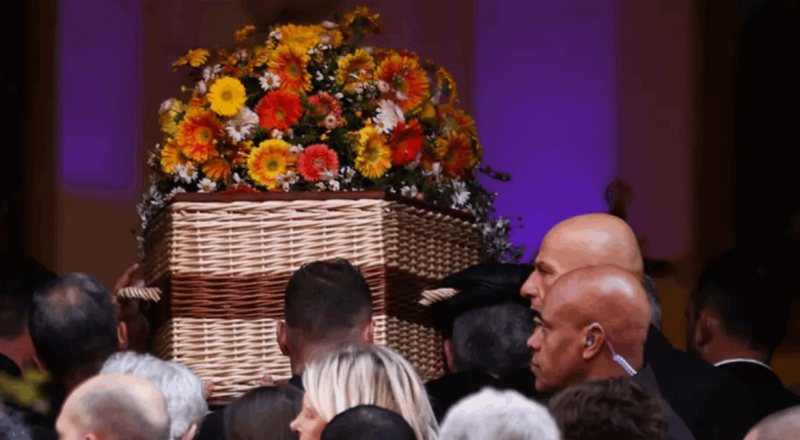وقد وُضع النعش الملفوف بغطاء من الخيزران بين صورتين كبيرتين للممثلة التي شكلت رمزا للإغراء في السينما، إحداهما تظهرها بابتسامة عريضة وشعر رماديّ على خلفية زرقاء، وأخرى تحمل فيها حيوان فقمة بين ذراعيها.